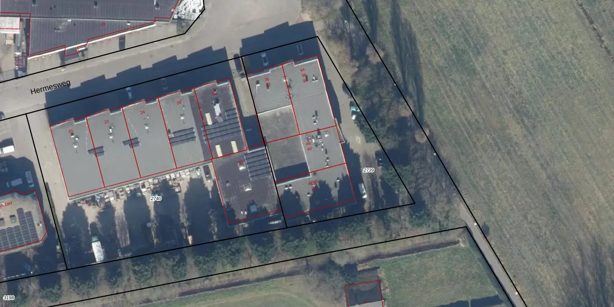 Het perceel waarop Hermesweg 40 staat heeft een oppervlakte van 2000 m². Dit is een zeer groot perceel. De perceeloppervlakte wordt geregistreerd door het Kadaster. Gedetailleerde informatie over de maten van dit perceel kunt u vinden in het rapport Kadastrale kaart met maatvoering van Hermesweg 40.