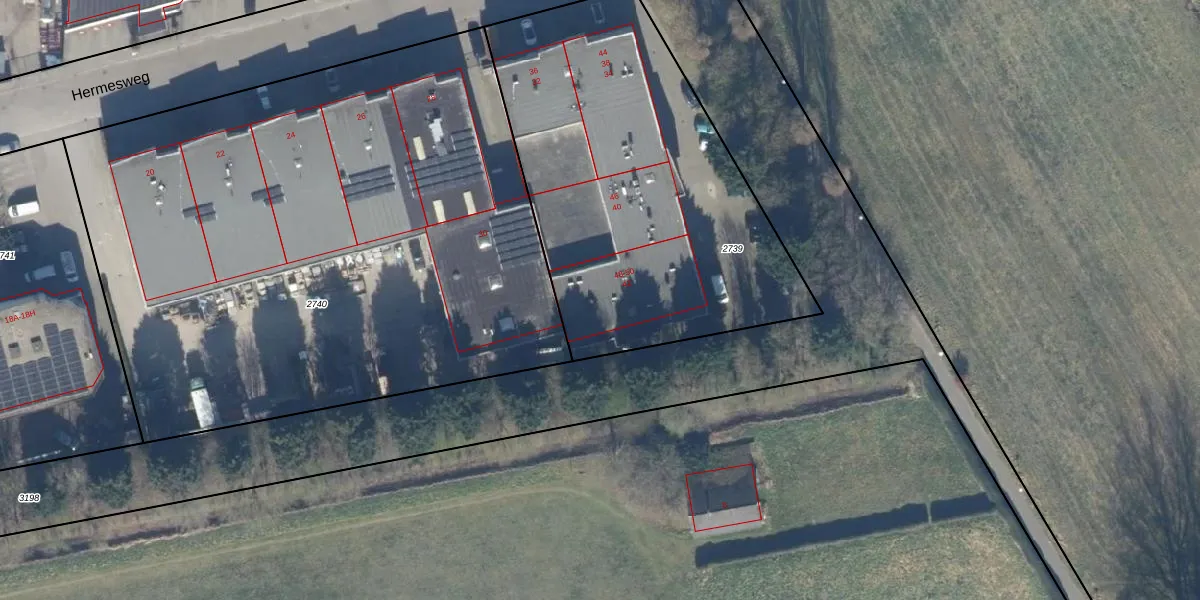 Het perceel waarop Hermesweg 48 staat heeft een oppervlakte van 2000 m². Dit is een zeer groot perceel. De perceeloppervlakte wordt geregistreerd door het Kadaster. Gedetailleerde informatie over de maten van dit perceel kunt u vinden in het rapport Kadastrale kaart met maatvoering van Hermesweg 48.