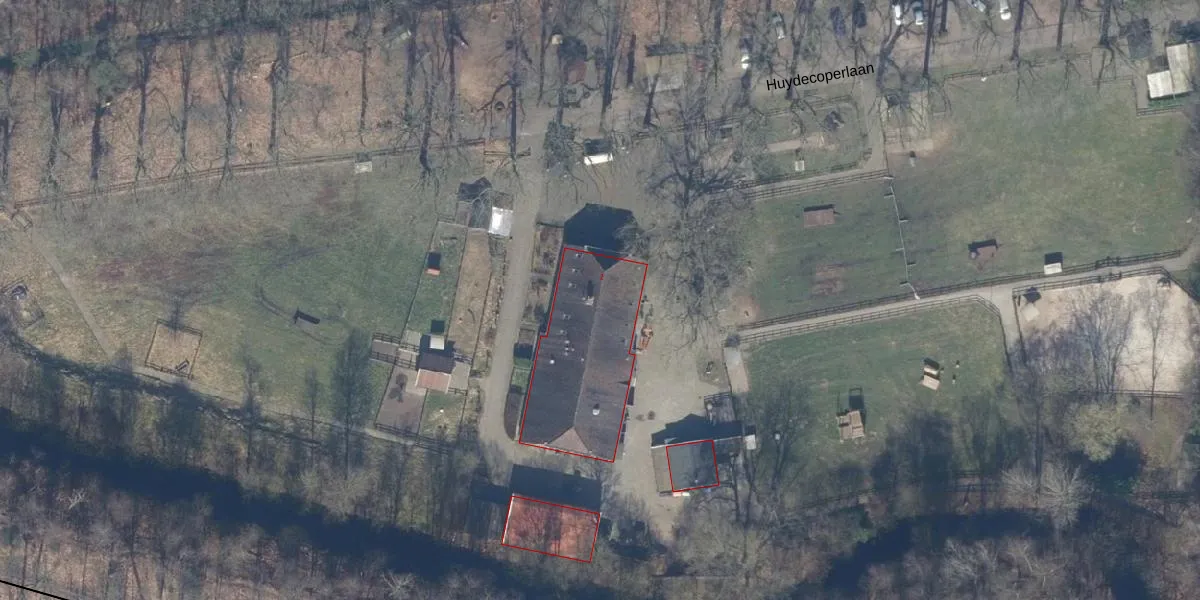 Het perceel waarop Huydecoperlaan 1 staat heeft een oppervlakte van 31,3 ha. Dit is een zeer groot perceel. De perceeloppervlakte wordt geregistreerd door het Kadaster. Gedetailleerde informatie over de maten van dit perceel kunt u vinden in het rapport Kadastrale kaart met maatvoering van Huydecoperlaan 1.
