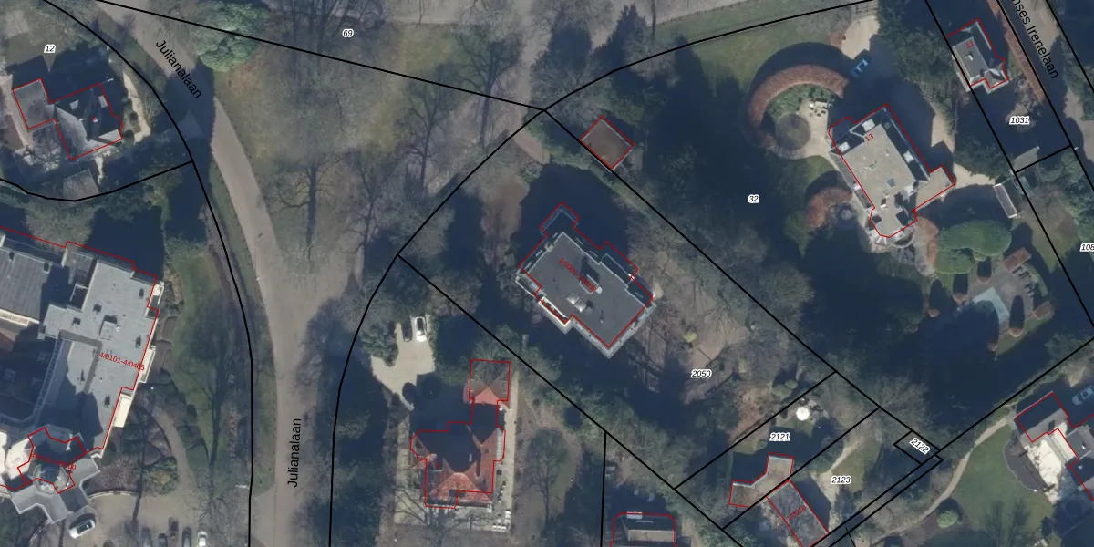 Julianalaan 1-0001 is gelegen op kadastraal perceel BAA01L2050. Deze kadastrale aanduiding is uniek en wordt gebruikt door het Kadaster om eigendomsrechten en andere zakelijke rechten vast te leggen. Het perceel maakt onderdeel uit van de kadastrale gemeente Baarn.