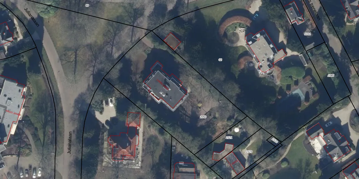 Het perceel waarop Julianalaan 1-0008 staat heeft een oppervlakte van 2540 m². Dit is een zeer groot perceel. De perceeloppervlakte wordt geregistreerd door het Kadaster. Gedetailleerde informatie over de maten van dit perceel kunt u vinden in het rapport Kadastrale kaart met maatvoering van Julianalaan 1-0008.