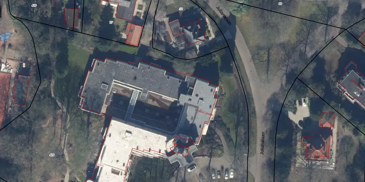 Het perceel waarop Julianalaan 4-0101 staat heeft een oppervlakte van 1,7 ha. Dit is een zeer groot perceel. De perceeloppervlakte wordt geregistreerd door het Kadaster. Gedetailleerde informatie over de maten van dit perceel kunt u vinden in het rapport Kadastrale kaart met maatvoering van Julianalaan 4-0101.