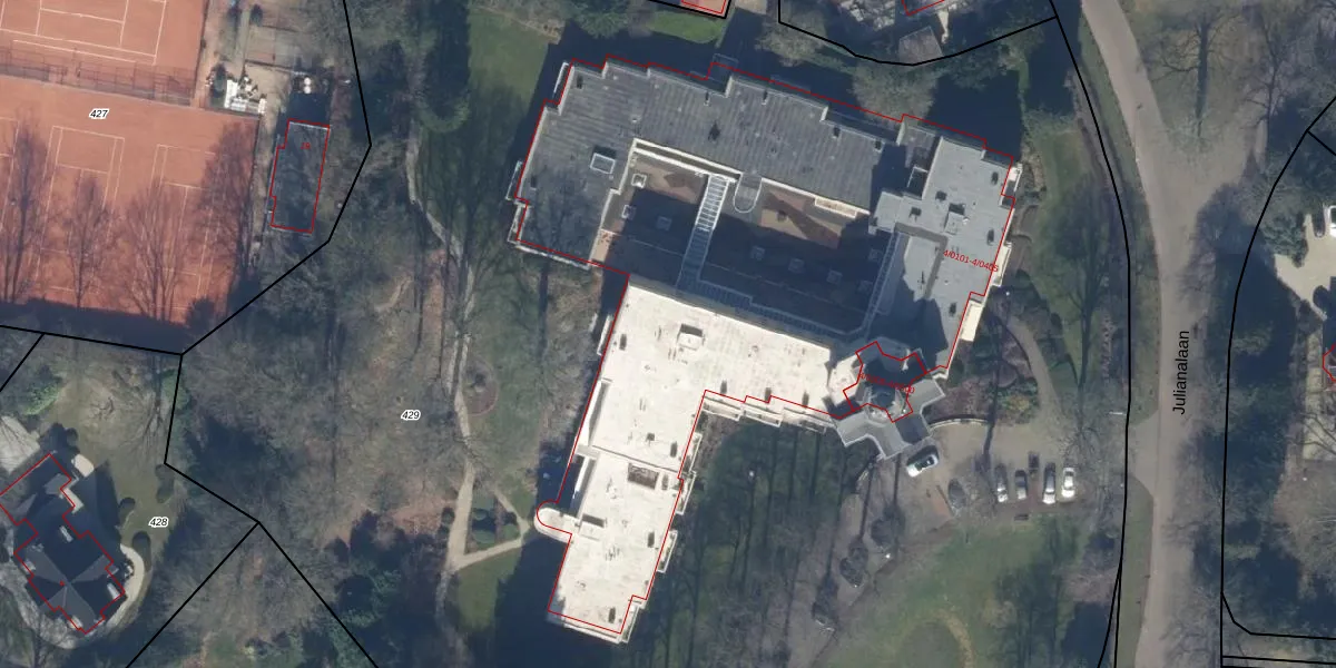 Het perceel waarop Julianalaan 4-0309 staat heeft een oppervlakte van 1,7 ha. Dit is een zeer groot perceel. De perceeloppervlakte wordt geregistreerd door het Kadaster. Gedetailleerde informatie over de maten van dit perceel kunt u vinden in het rapport Kadastrale kaart met maatvoering van Julianalaan 4-0309.