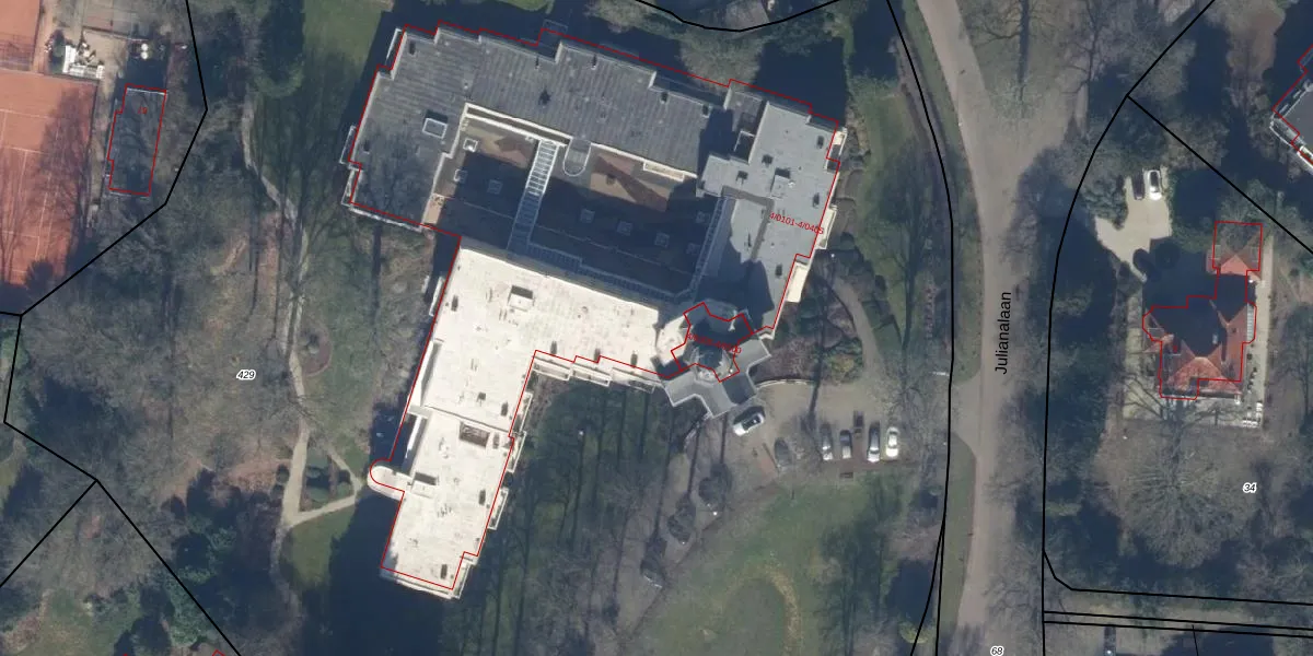 Het perceel waarop Julianalaan 4-0401 staat heeft een oppervlakte van 1,7 ha. Dit is een zeer groot perceel. De perceeloppervlakte wordt geregistreerd door het Kadaster. Gedetailleerde informatie over de maten van dit perceel kunt u vinden in het rapport Kadastrale kaart met maatvoering van Julianalaan 4-0401.
