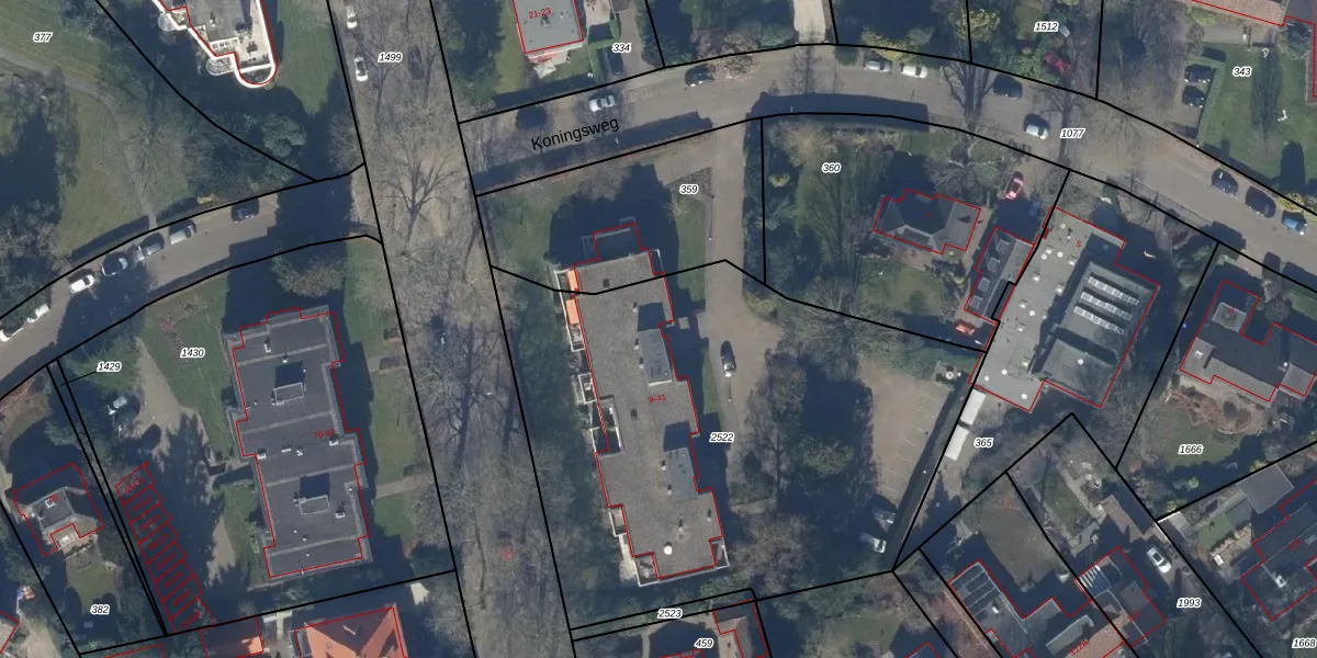 Het perceel waarop Koningsweg 11 staat heeft een oppervlakte van 2857 m². Dit is een zeer groot perceel. De perceeloppervlakte wordt geregistreerd door het Kadaster. Gedetailleerde informatie over de maten van dit perceel kunt u vinden in het rapport Kadastrale kaart met maatvoering van Koningsweg 11.