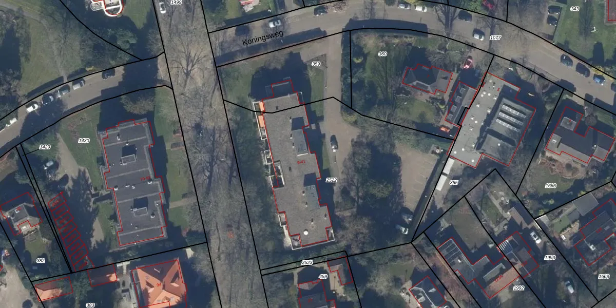 Het perceel waarop Koningsweg 13 staat heeft een oppervlakte van 2857 m². Dit is een zeer groot perceel. De perceeloppervlakte wordt geregistreerd door het Kadaster. Gedetailleerde informatie over de maten van dit perceel kunt u vinden in het rapport Kadastrale kaart met maatvoering van Koningsweg 13.
