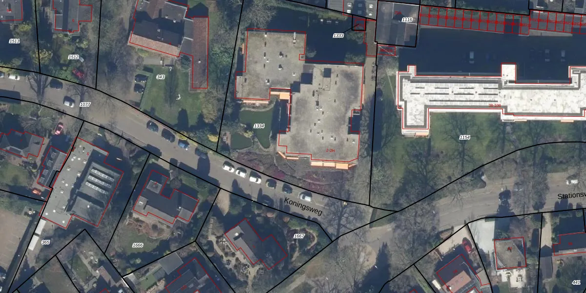 Het perceel waarop Koningsweg 2 staat heeft een oppervlakte van 3078 m². Dit is een zeer groot perceel. De perceeloppervlakte wordt geregistreerd door het Kadaster. Gedetailleerde informatie over de maten van dit perceel kunt u vinden in het rapport Kadastrale kaart met maatvoering van Koningsweg 2.