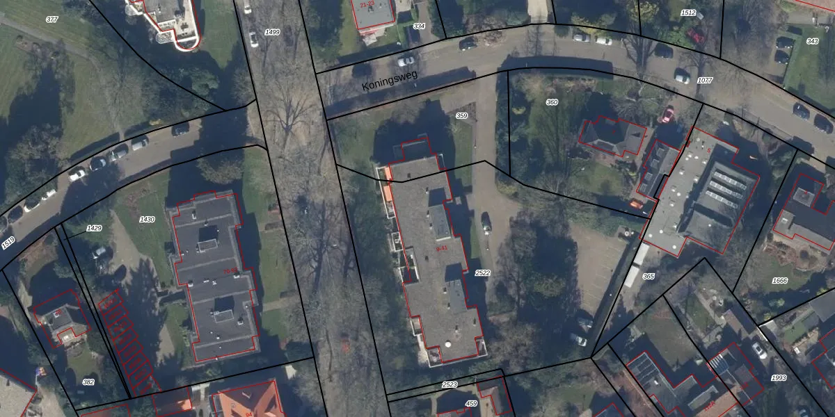 Het perceel waarop Koningsweg 23 staat heeft een oppervlakte van 2857 m². Dit is een zeer groot perceel. De perceeloppervlakte wordt geregistreerd door het Kadaster. Gedetailleerde informatie over de maten van dit perceel kunt u vinden in het rapport Kadastrale kaart met maatvoering van Koningsweg 23.