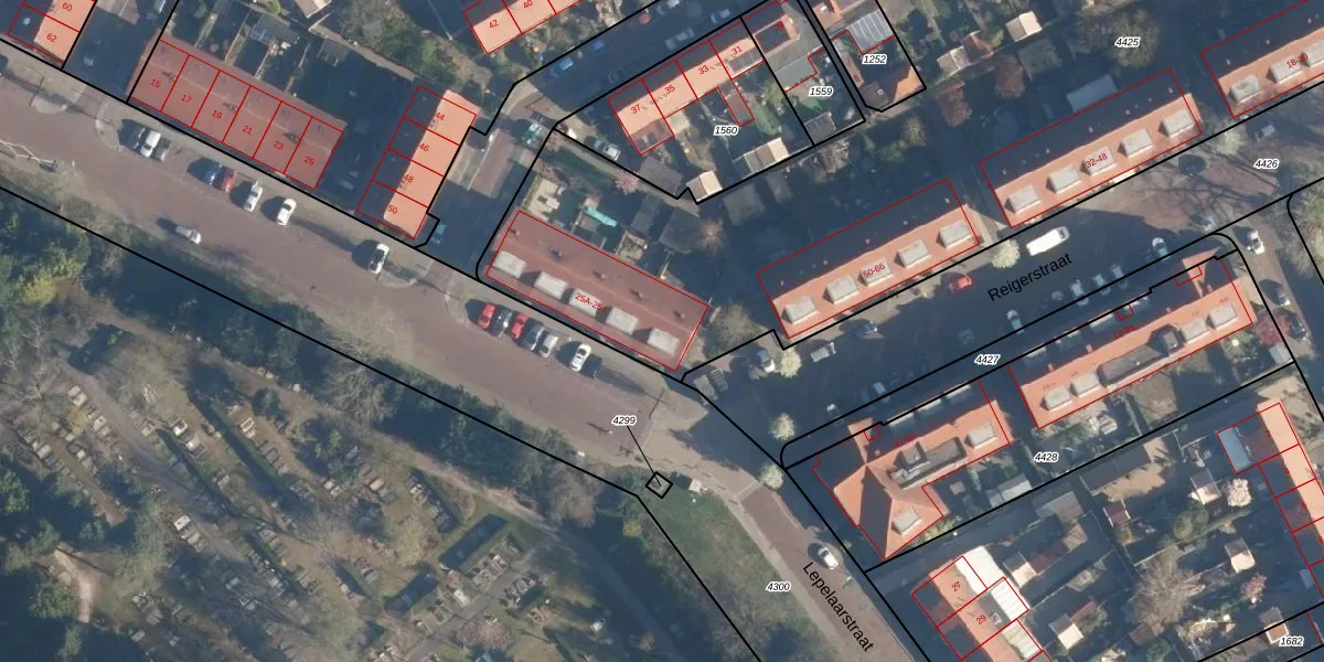 Het perceel waarop Lepelaarstraat 25-D staat heeft een oppervlakte van 6215 m². Dit is een zeer groot perceel. De perceeloppervlakte wordt geregistreerd door het Kadaster. Gedetailleerde informatie over de maten van dit perceel kunt u vinden in het rapport Kadastrale kaart met maatvoering van Lepelaarstraat 25-D.