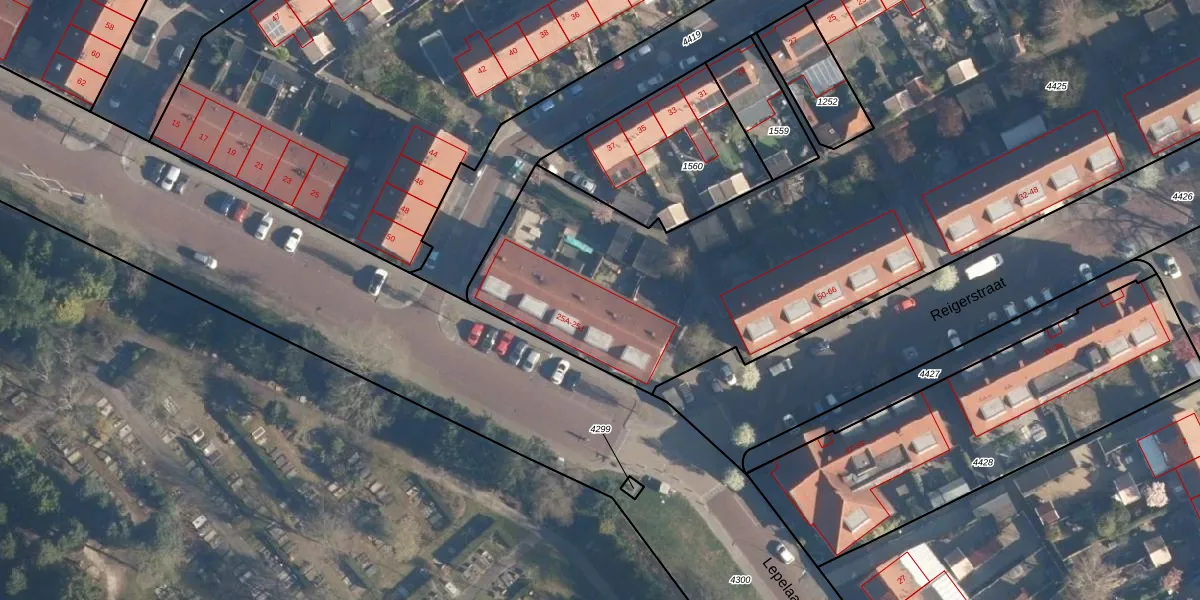 Het perceel waarop Lepelaarstraat 25-G staat heeft een oppervlakte van 6215 m². Dit is een zeer groot perceel. De perceeloppervlakte wordt geregistreerd door het Kadaster. Gedetailleerde informatie over de maten van dit perceel kunt u vinden in het rapport Kadastrale kaart met maatvoering van Lepelaarstraat 25-G.