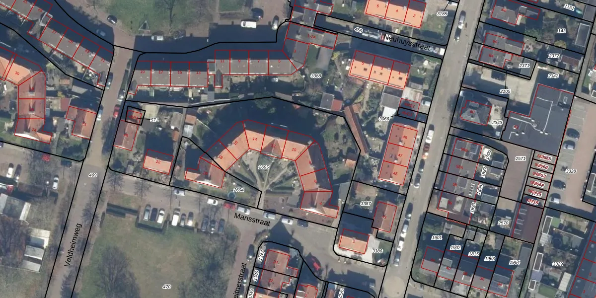 Het perceel waarop Marisstraat 10 staat heeft een oppervlakte van 2214 m². Dit is een zeer groot perceel. De perceeloppervlakte wordt geregistreerd door het Kadaster. Gedetailleerde informatie over de maten van dit perceel kunt u vinden in het rapport Kadastrale kaart met maatvoering van Marisstraat 10.