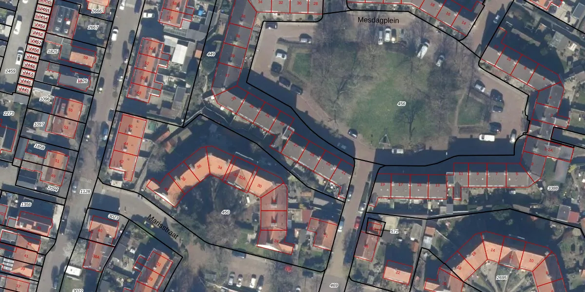 Het perceel waarop Mesdagplein 27 staat heeft een oppervlakte van 2130 m². Dit is een zeer groot perceel. De perceeloppervlakte wordt geregistreerd door het Kadaster. Gedetailleerde informatie over de maten van dit perceel kunt u vinden in het rapport Kadastrale kaart met maatvoering van Mesdagplein 27.