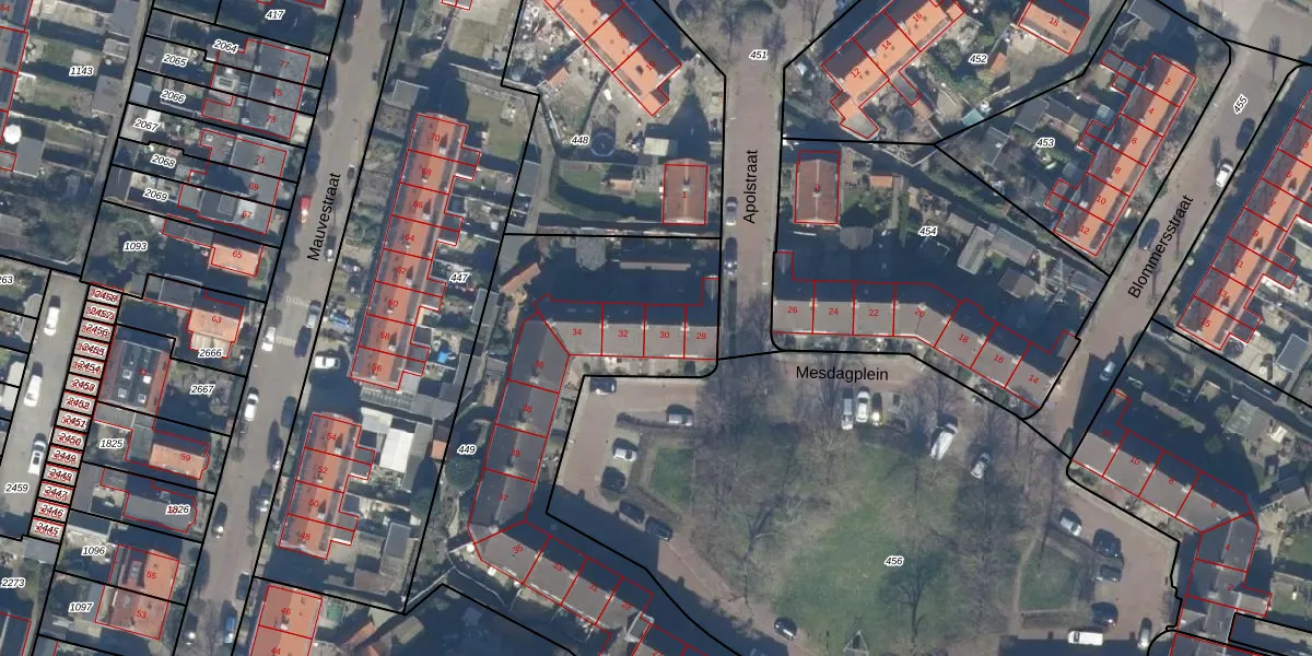 Het perceel waarop Mesdagplein 30 staat heeft een oppervlakte van 2130 m². Dit is een zeer groot perceel. De perceeloppervlakte wordt geregistreerd door het Kadaster. Gedetailleerde informatie over de maten van dit perceel kunt u vinden in het rapport Kadastrale kaart met maatvoering van Mesdagplein 30.