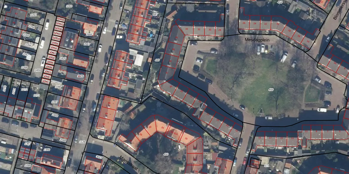 Het perceel waarop Mesdagplein 35 staat heeft een oppervlakte van 2130 m². Dit is een zeer groot perceel. De perceeloppervlakte wordt geregistreerd door het Kadaster. Gedetailleerde informatie over de maten van dit perceel kunt u vinden in het rapport Kadastrale kaart met maatvoering van Mesdagplein 35.