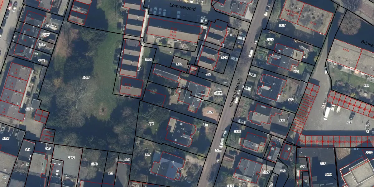 Het perceel waarop Mollerusstraat 7 staat heeft een oppervlakte van 485 m². Dit is een groot perceel. De perceeloppervlakte wordt geregistreerd door het Kadaster. Gedetailleerde informatie over de maten van dit perceel kunt u vinden in het rapport Kadastrale kaart met maatvoering van Mollerusstraat 7.