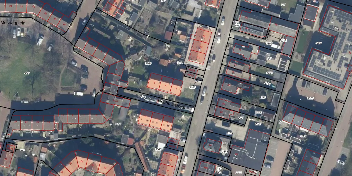 Neuhuysstraat 2 is gelegen op kadastraal perceel BAA01H3184. Deze kadastrale aanduiding is uniek en wordt gebruikt door het Kadaster om eigendomsrechten en andere zakelijke rechten vast te leggen. Het perceel maakt onderdeel uit van de kadastrale gemeente Baarn.