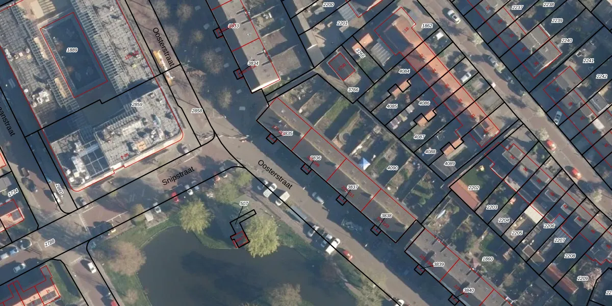 Het perceel waarop Oosterstraat 189 staat heeft een oppervlakte van 1626 m². Dit is een zeer groot perceel. De perceeloppervlakte wordt geregistreerd door het Kadaster. Gedetailleerde informatie over de maten van dit perceel kunt u vinden in het rapport Kadastrale kaart met maatvoering van Oosterstraat 189.