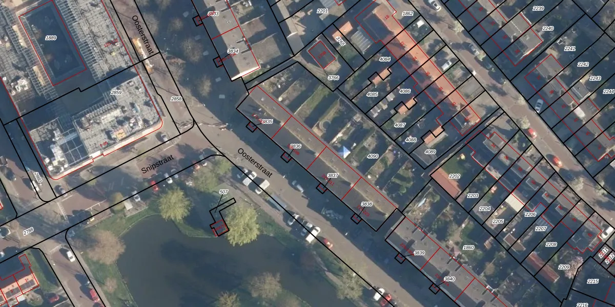 Het perceel waarop Oosterstraat 197 staat heeft een oppervlakte van 1626 m². Dit is een zeer groot perceel. De perceeloppervlakte wordt geregistreerd door het Kadaster. Gedetailleerde informatie over de maten van dit perceel kunt u vinden in het rapport Kadastrale kaart met maatvoering van Oosterstraat 197.