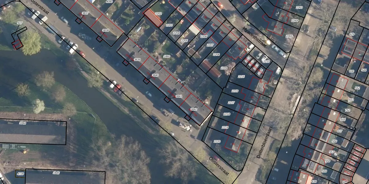 Het perceel waarop Oosterstraat 259-A staat heeft een oppervlakte van 1465 m². Dit is een zeer groot perceel. De perceeloppervlakte wordt geregistreerd door het Kadaster. Gedetailleerde informatie over de maten van dit perceel kunt u vinden in het rapport Kadastrale kaart met maatvoering van Oosterstraat 259-A.