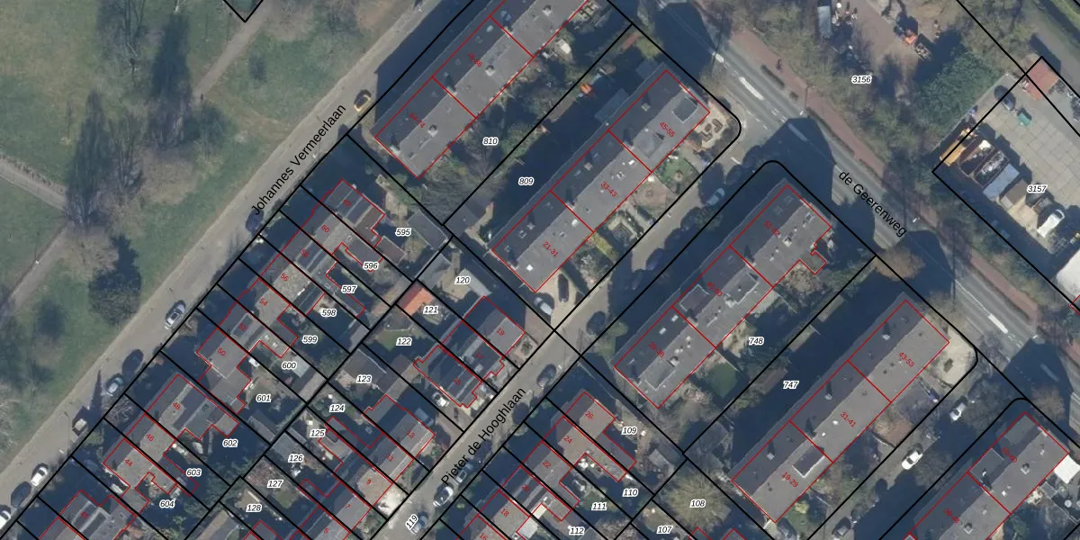 Het perceel waarop Pieter de Hooghlaan 21 staat heeft een oppervlakte van 1465 m². Dit is een zeer groot perceel. De perceeloppervlakte wordt geregistreerd door het Kadaster. Gedetailleerde informatie over de maten van dit perceel kunt u vinden in het rapport Kadastrale kaart met maatvoering van Pieter de Hooghlaan 21.