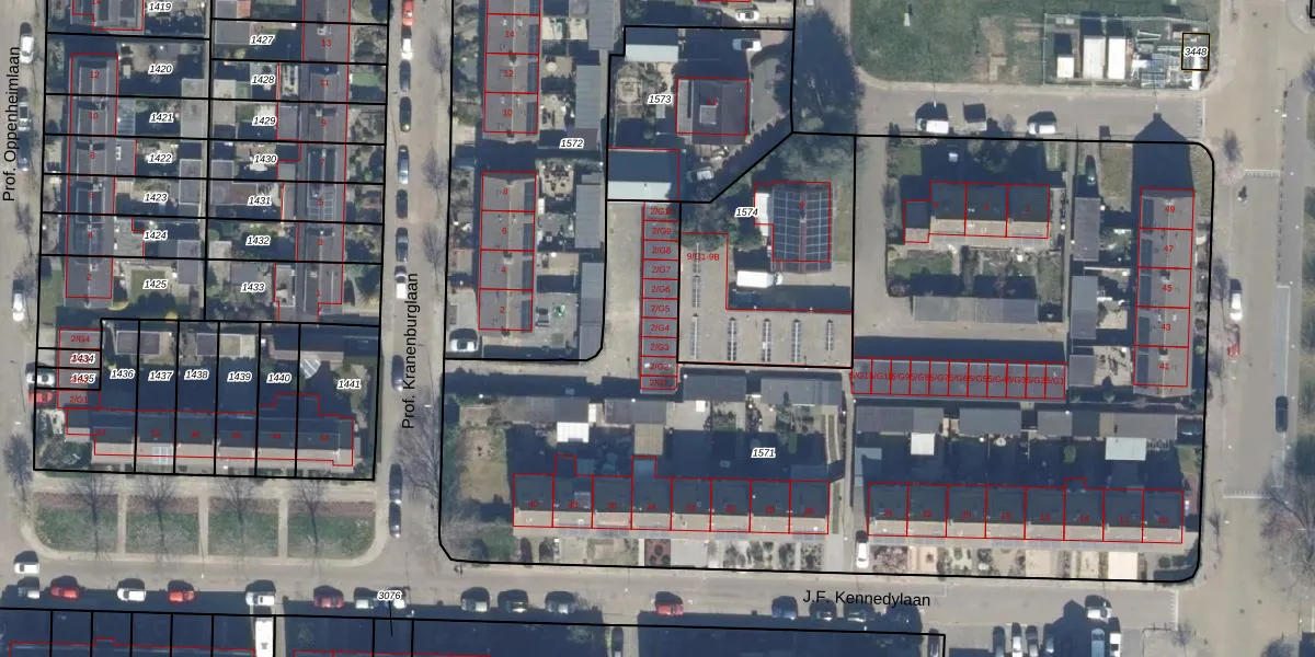 Het perceel waarop Prof. Kranenburglaan 2-G4 staat heeft een oppervlakte van 5838 m². Dit is een zeer groot perceel. De perceeloppervlakte wordt geregistreerd door het Kadaster. Gedetailleerde informatie over de maten van dit perceel kunt u vinden in het rapport Kadastrale kaart met maatvoering van Prof. Kranenburglaan 2-G4.