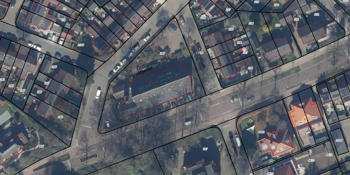 Het perceel waarop Ruysdaelhof 7 staat heeft een oppervlakte van 2040 m². Dit is een zeer groot perceel. De perceeloppervlakte wordt geregistreerd door het Kadaster. Gedetailleerde informatie over de maten van dit perceel kunt u vinden in het rapport Kadastrale kaart met maatvoering van Ruysdaelhof 7.