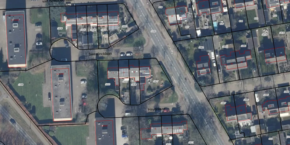 Sweelincklaan 1 is gelegen op kadastraal perceel BAA01H1607. Deze kadastrale aanduiding is uniek en wordt gebruikt door het Kadaster om eigendomsrechten en andere zakelijke rechten vast te leggen. Het perceel maakt onderdeel uit van de kadastrale gemeente Baarn.