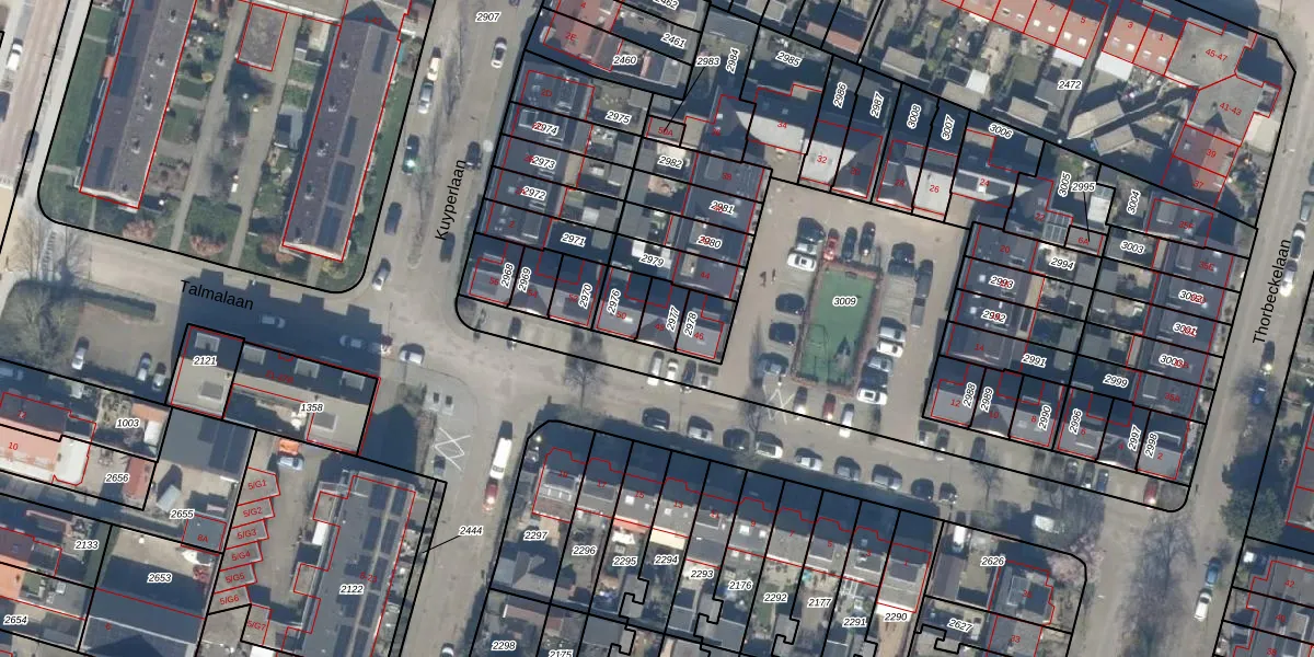 Het perceel waarop Talmalaan 48 staat heeft een oppervlakte van 61 m². Dit is een klein perceel. De perceeloppervlakte wordt geregistreerd door het Kadaster. Gedetailleerde informatie over de maten van dit perceel kunt u vinden in het rapport Kadastrale kaart met maatvoering van Talmalaan 48.
