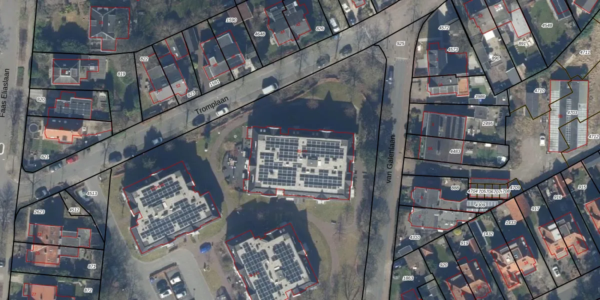 Het perceel waarop Tromplaan 53 staat heeft een oppervlakte van 7558 m². Dit is een zeer groot perceel. De perceeloppervlakte wordt geregistreerd door het Kadaster. Gedetailleerde informatie over de maten van dit perceel kunt u vinden in het rapport Kadastrale kaart met maatvoering van Tromplaan 53.