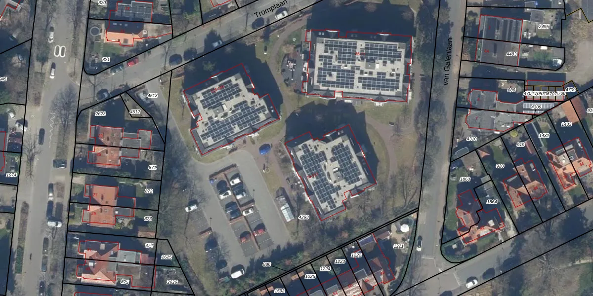 Het perceel waarop Tromplaan 79 staat heeft een oppervlakte van 7558 m². Dit is een zeer groot perceel. De perceeloppervlakte wordt geregistreerd door het Kadaster. Gedetailleerde informatie over de maten van dit perceel kunt u vinden in het rapport Kadastrale kaart met maatvoering van Tromplaan 79.