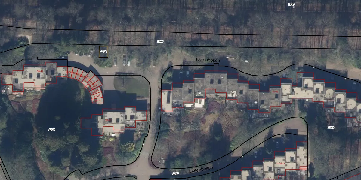 Het perceel waarop Uytenbosch 16-G1 staat heeft een oppervlakte van 6895 m². Dit is een zeer groot perceel. De perceeloppervlakte wordt geregistreerd door het Kadaster. Gedetailleerde informatie over de maten van dit perceel kunt u vinden in het rapport Kadastrale kaart met maatvoering van Uytenbosch 16-G1.