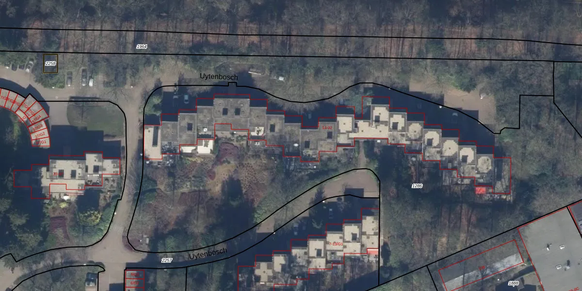 Het perceel waarop Uytenbosch 22 staat heeft een oppervlakte van 6895 m². Dit is een zeer groot perceel. De perceeloppervlakte wordt geregistreerd door het Kadaster. Gedetailleerde informatie over de maten van dit perceel kunt u vinden in het rapport Kadastrale kaart met maatvoering van Uytenbosch 22.