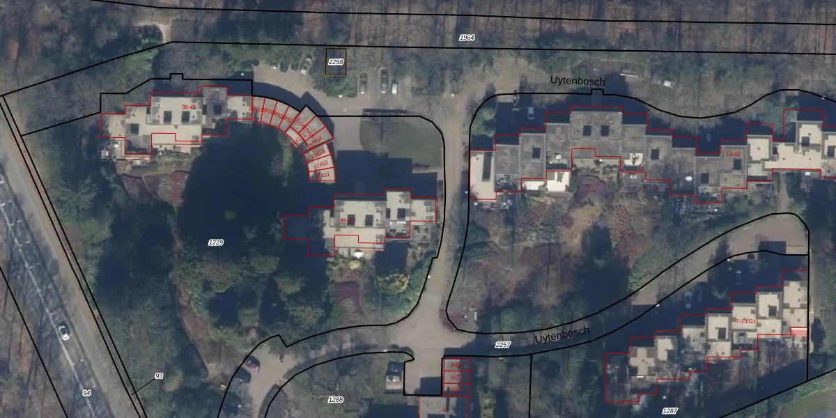 Het perceel waarop Uytenbosch 33 staat heeft een oppervlakte van 5955 m². Dit is een zeer groot perceel. De perceeloppervlakte wordt geregistreerd door het Kadaster. Gedetailleerde informatie over de maten van dit perceel kunt u vinden in het rapport Kadastrale kaart met maatvoering van Uytenbosch 33.