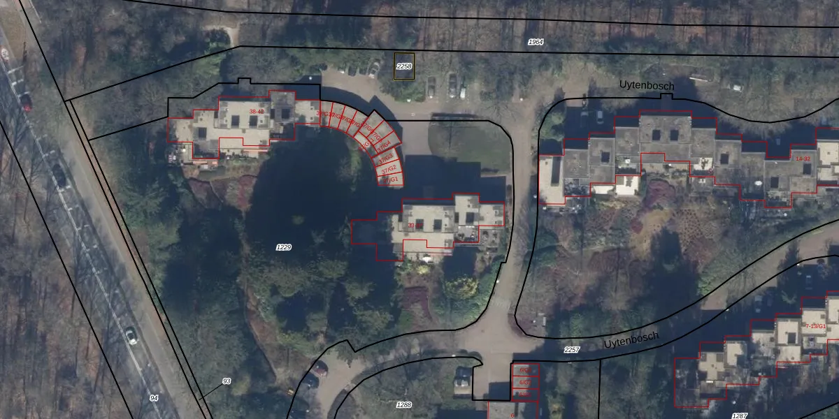 Het perceel waarop Uytenbosch 35 staat heeft een oppervlakte van 5955 m². Dit is een zeer groot perceel. De perceeloppervlakte wordt geregistreerd door het Kadaster. Gedetailleerde informatie over de maten van dit perceel kunt u vinden in het rapport Kadastrale kaart met maatvoering van Uytenbosch 35.