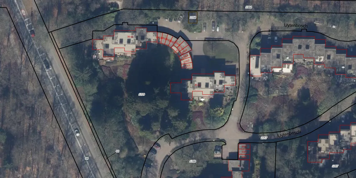 Het perceel waarop Uytenbosch 37 staat heeft een oppervlakte van 5955 m². Dit is een zeer groot perceel. De perceeloppervlakte wordt geregistreerd door het Kadaster. Gedetailleerde informatie over de maten van dit perceel kunt u vinden in het rapport Kadastrale kaart met maatvoering van Uytenbosch 37.