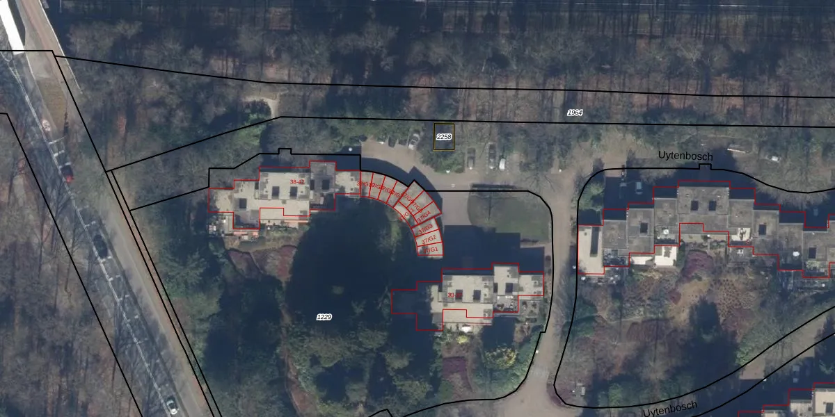 Het perceel waarop Uytenbosch 37-G5 staat heeft een oppervlakte van 5955 m². Dit is een zeer groot perceel. De perceeloppervlakte wordt geregistreerd door het Kadaster. Gedetailleerde informatie over de maten van dit perceel kunt u vinden in het rapport Kadastrale kaart met maatvoering van Uytenbosch 37-G5.