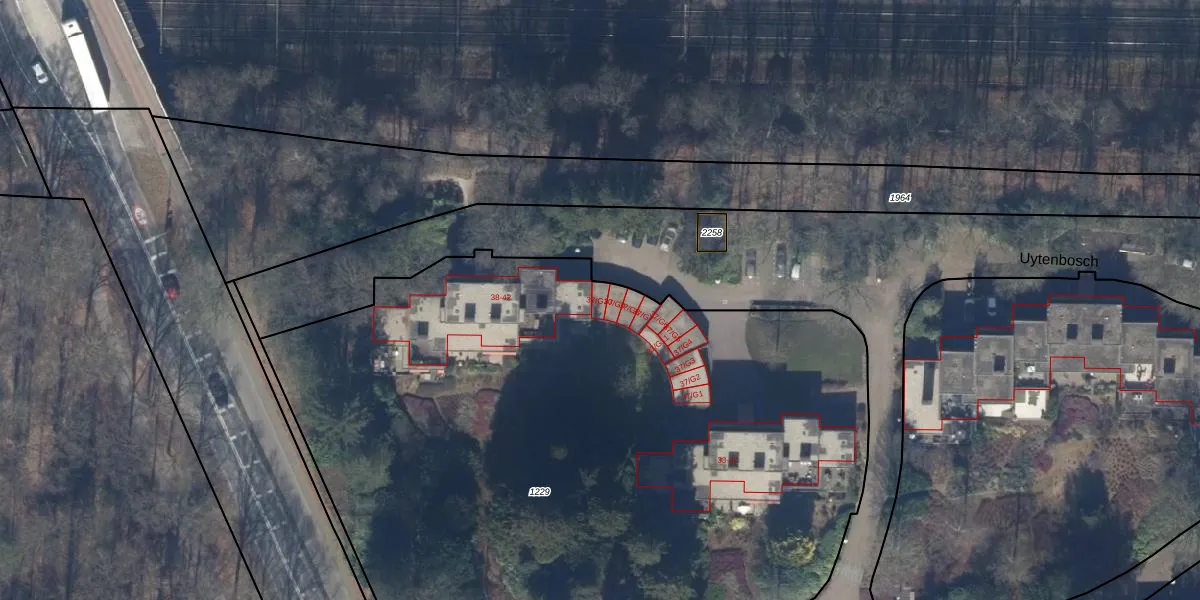 Het perceel waarop Uytenbosch 37-G10 staat heeft een oppervlakte van 5955 m². Dit is een zeer groot perceel. De perceeloppervlakte wordt geregistreerd door het Kadaster. Gedetailleerde informatie over de maten van dit perceel kunt u vinden in het rapport Kadastrale kaart met maatvoering van Uytenbosch 37-G10.