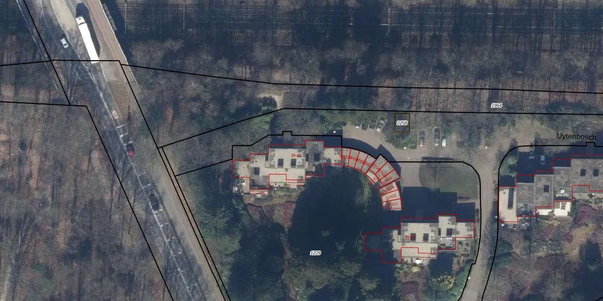 Het perceel waarop Uytenbosch 39 staat heeft een oppervlakte van 5955 m². Dit is een zeer groot perceel. De perceeloppervlakte wordt geregistreerd door het Kadaster. Gedetailleerde informatie over de maten van dit perceel kunt u vinden in het rapport Kadastrale kaart met maatvoering van Uytenbosch 39.