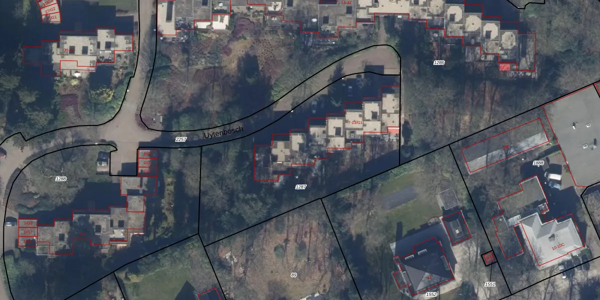 Uytenbosch 9 is gelegen op kadastraal perceel BAA01K1287. Deze kadastrale aanduiding is uniek en wordt gebruikt door het Kadaster om eigendomsrechten en andere zakelijke rechten vast te leggen. Het perceel maakt onderdeel uit van de kadastrale gemeente Baarn.