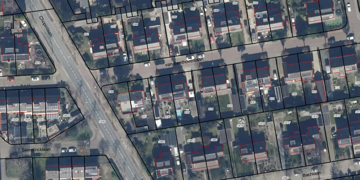Het perceel waarop van Beethovenlaan 21 staat heeft een oppervlakte van 348 m². Dit is een groot perceel. De perceeloppervlakte wordt geregistreerd door het Kadaster. Gedetailleerde informatie over de maten van dit perceel kunt u vinden in het rapport Kadastrale kaart met maatvoering van van Beethovenlaan 21.
