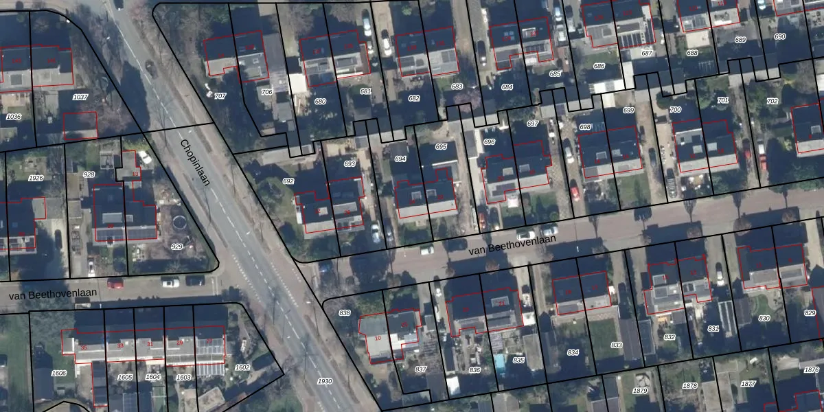 Het perceel waarop van Beethovenlaan 24 staat heeft een oppervlakte van 323 m². Dit is een groot perceel. De perceeloppervlakte wordt geregistreerd door het Kadaster. Gedetailleerde informatie over de maten van dit perceel kunt u vinden in het rapport Kadastrale kaart met maatvoering van van Beethovenlaan 24.