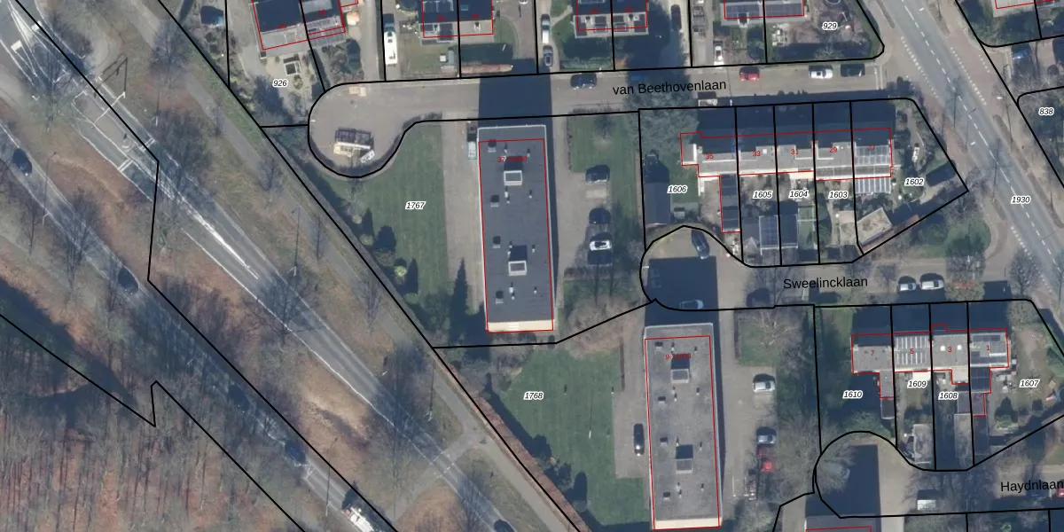 Het perceel waarop van Beethovenlaan 59-G1 staat heeft een oppervlakte van 2214 m². Dit is een zeer groot perceel. De perceeloppervlakte wordt geregistreerd door het Kadaster. Gedetailleerde informatie over de maten van dit perceel kunt u vinden in het rapport Kadastrale kaart met maatvoering van van Beethovenlaan 59-G1.