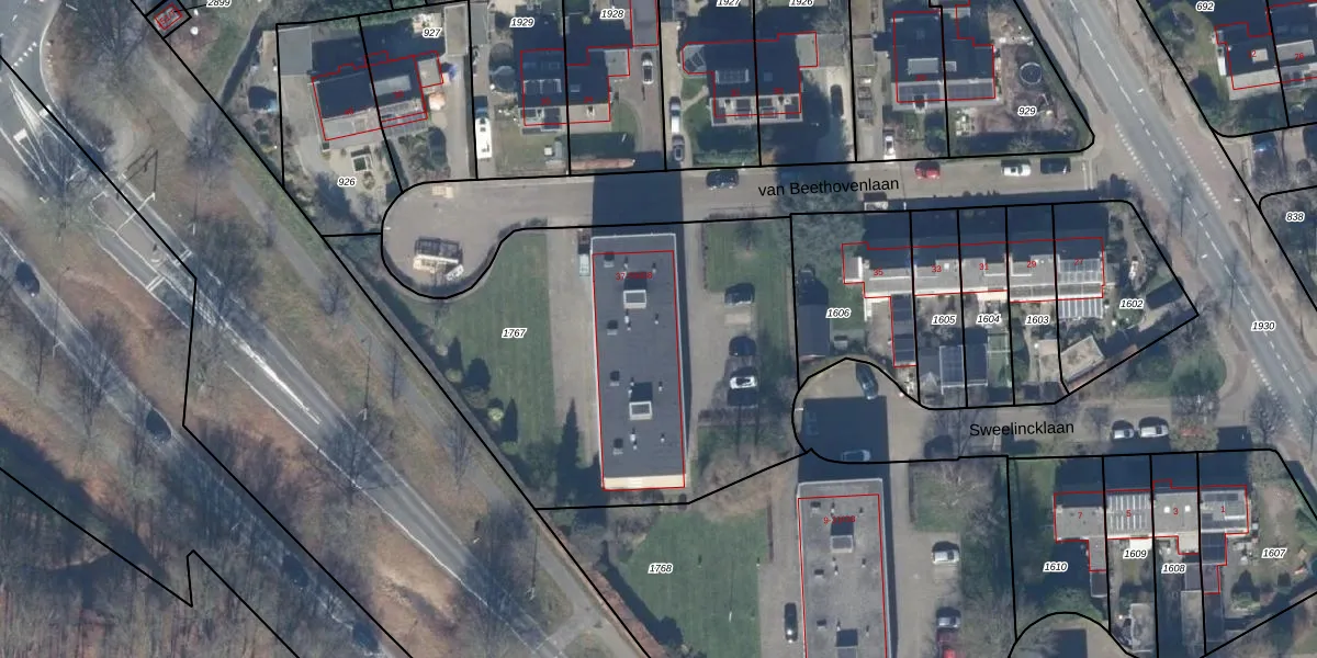 Het perceel waarop van Beethovenlaan 59-G4 staat heeft een oppervlakte van 2214 m². Dit is een zeer groot perceel. De perceeloppervlakte wordt geregistreerd door het Kadaster. Gedetailleerde informatie over de maten van dit perceel kunt u vinden in het rapport Kadastrale kaart met maatvoering van van Beethovenlaan 59-G4.