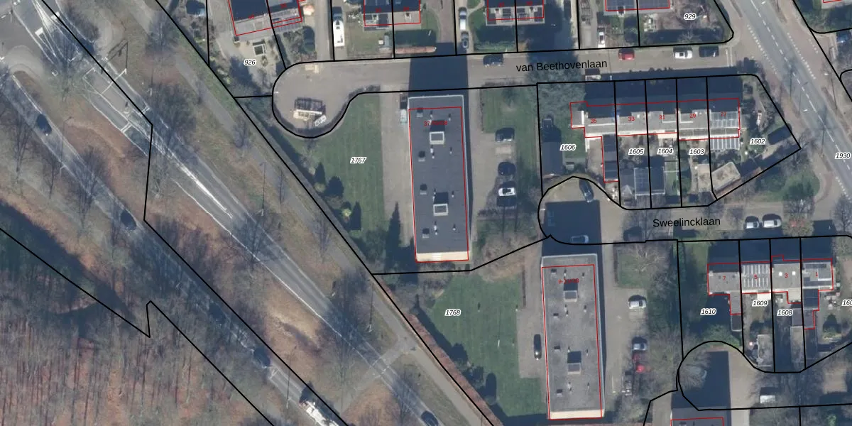 Het perceel waarop van Beethovenlaan 59-G5 staat heeft een oppervlakte van 2214 m². Dit is een zeer groot perceel. De perceeloppervlakte wordt geregistreerd door het Kadaster. Gedetailleerde informatie over de maten van dit perceel kunt u vinden in het rapport Kadastrale kaart met maatvoering van van Beethovenlaan 59-G5.