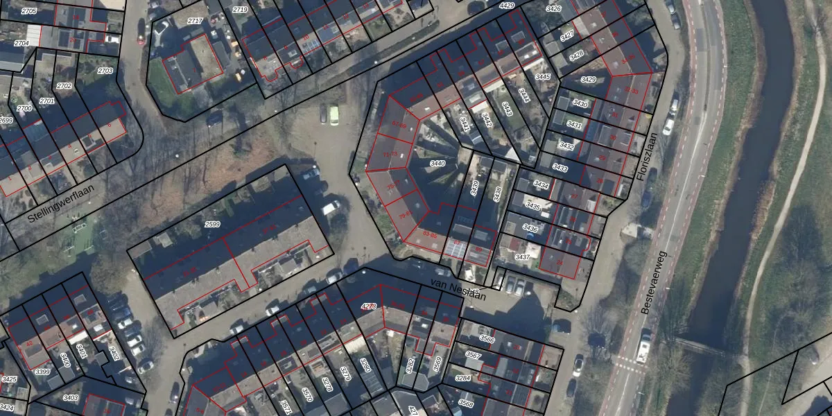 Het perceel waarop van Neslaan 81 staat heeft een oppervlakte van 915 m². Dit is een groot perceel. De perceeloppervlakte wordt geregistreerd door het Kadaster. Gedetailleerde informatie over de maten van dit perceel kunt u vinden in het rapport Kadastrale kaart met maatvoering van van Neslaan 81.