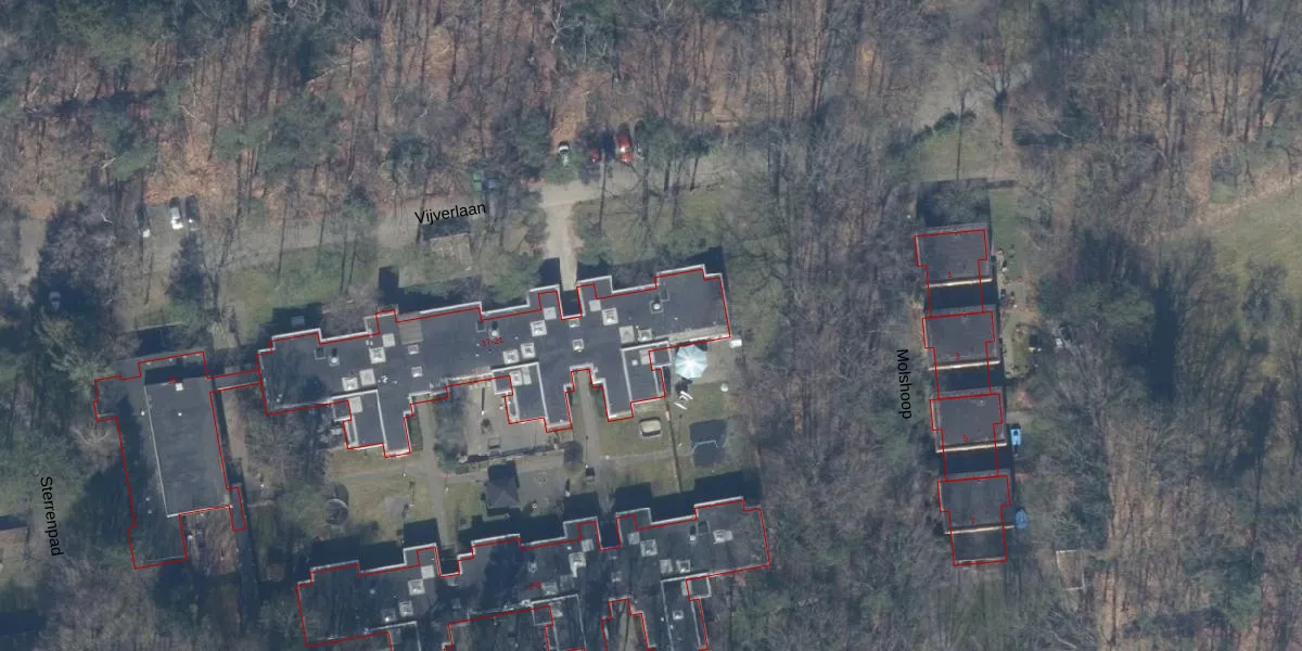 Het perceel waarop Vijverlaan 21 staat heeft een oppervlakte van 31,3 ha. Dit is een zeer groot perceel. De perceeloppervlakte wordt geregistreerd door het Kadaster. Gedetailleerde informatie over de maten van dit perceel kunt u vinden in het rapport Kadastrale kaart met maatvoering van Vijverlaan 21.