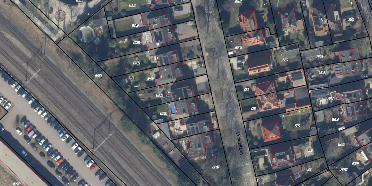 Het perceel waarop Vondellaan 18 staat heeft een oppervlakte van 415 m². Dit is een groot perceel. De perceeloppervlakte wordt geregistreerd door het Kadaster. Gedetailleerde informatie over de maten van dit perceel kunt u vinden in het rapport Kadastrale kaart met maatvoering van Vondellaan 18.