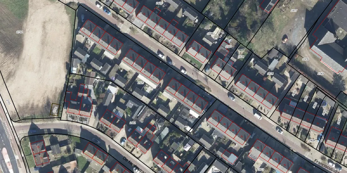 Het perceel waarop Franciscusstraat 18 staat heeft een oppervlakte van 2495 m². Dit is een zeer groot perceel. De perceeloppervlakte wordt geregistreerd door het Kadaster. Gedetailleerde informatie over de maten van dit perceel kunt u vinden in het rapport Kadastrale kaart met maatvoering van Franciscusstraat 18.