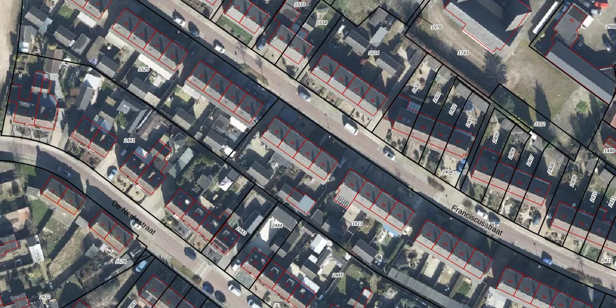 Het perceel waarop Franciscusstraat 30 staat heeft een oppervlakte van 3530 m². Dit is een zeer groot perceel. De perceeloppervlakte wordt geregistreerd door het Kadaster. Gedetailleerde informatie over de maten van dit perceel kunt u vinden in het rapport Kadastrale kaart met maatvoering van Franciscusstraat 30.
