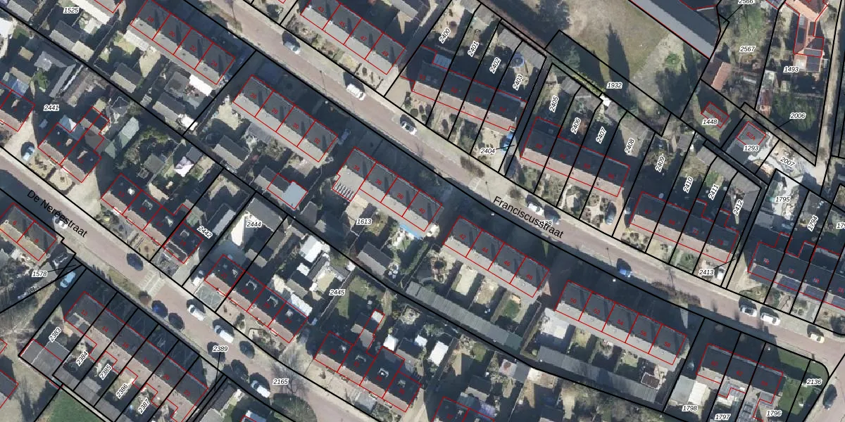 Het perceel waarop Franciscusstraat 40 staat heeft een oppervlakte van 3530 m². Dit is een zeer groot perceel. De perceeloppervlakte wordt geregistreerd door het Kadaster. Gedetailleerde informatie over de maten van dit perceel kunt u vinden in het rapport Kadastrale kaart met maatvoering van Franciscusstraat 40.